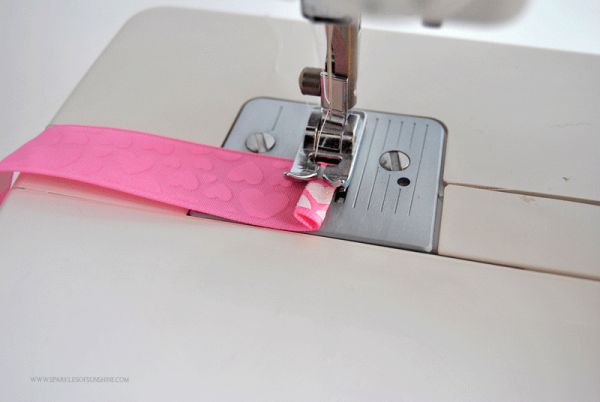 Agora, costure a ponta em que está com o elástico, para prendê-lo na ponta da fita.