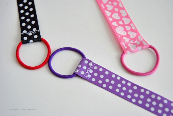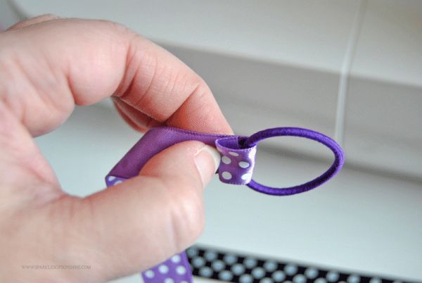 Logo após, na outra ponta do pedaço de fita, acrescente um círculo do elástico escolhido ou acrescente o elástico para cabelo.