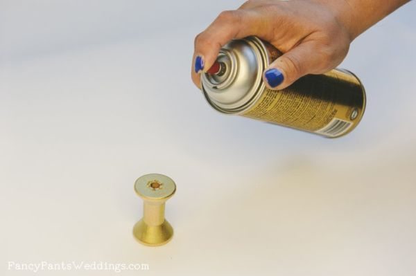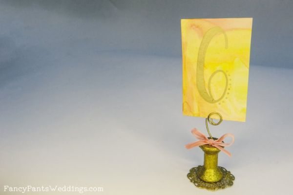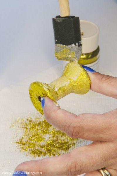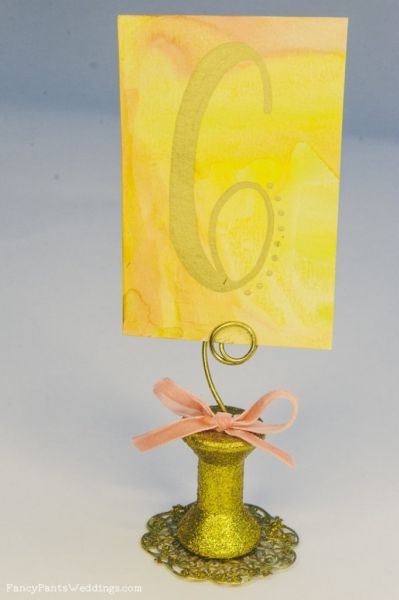 Créditos:http://www.fancypantsweddings.com/gold-glitter-wood-spool-table-number-holder-project/.