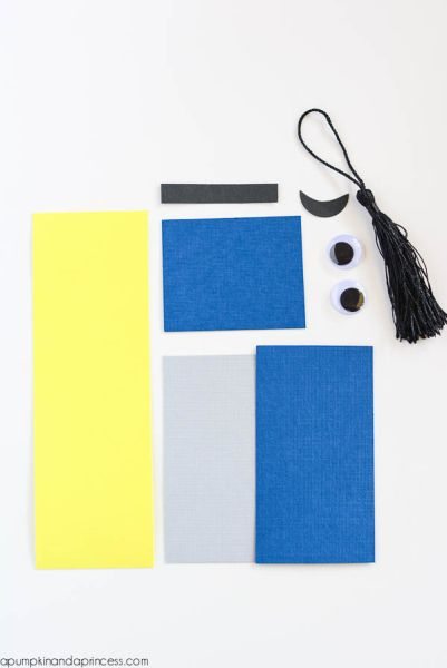 Comece cortando uma tira larga no papel amarelo. Depois corte um retângulo maior no papel azul e um retângulo um pouco menor no papel cinza. Corte um quadrado no papel azul e corte uma tira no papel preto e também uma boquinha no papel preto.