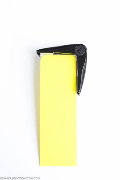 Em seguida, arredonde os dois cantos superiores da peça amarela, com o auxílio do cortador específico ou de uma tesoura comum, caso você não possua o cortador.