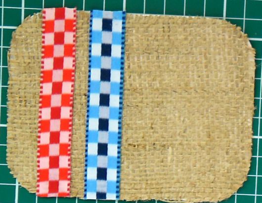 Em seguida, passe cola branca em dois pedaços de fita xadrez (com cores e modelos diferentes) e posicione-as, colando uma do lado da outra na tampa da marmita, mas deixando um pequeno espaço entre elas.