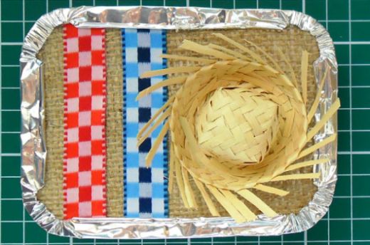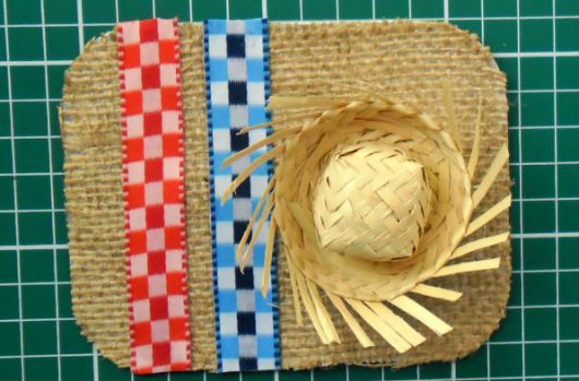 Logo após, com o auxílio da cola quente, cole o minichapéu de palha na tampa da marmita, ao lado das fitas estampadas com xadrez.