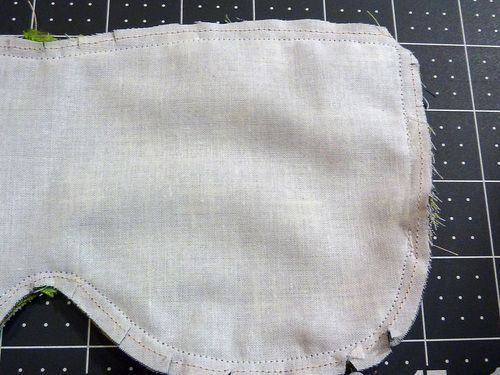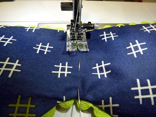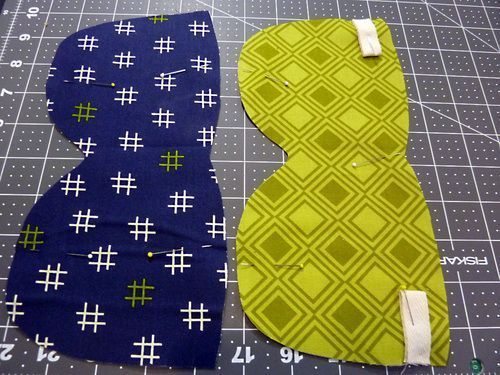 Em seguida, posicione as quatro partes juntas, com os lados do direito dos tecidos juntos, para dentro, e costure ao redor, mas deixando uma abertura em um dos lados, perto da fita. Faça piques.