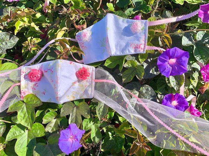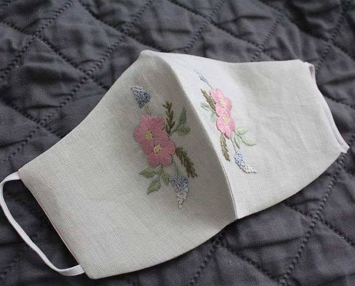 Máscara com bordado de flores feito na máquina