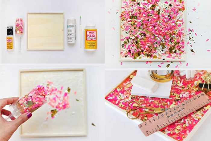 Aplique cola para decoupage sobre a peça de MDF. Jogue os confetes por cima e balance a peça, para espalhar bem e para retirar o excesso de confetes. Deixe secar muito bem. Para finalizar a sua peça, basta aplicar mais uma ou duas camadas de cola para decoupage sobre toda a peça, para impermeabilizar, mas sempre deixando a cola secar muito bem entre uma camada e outra. E está pronto!