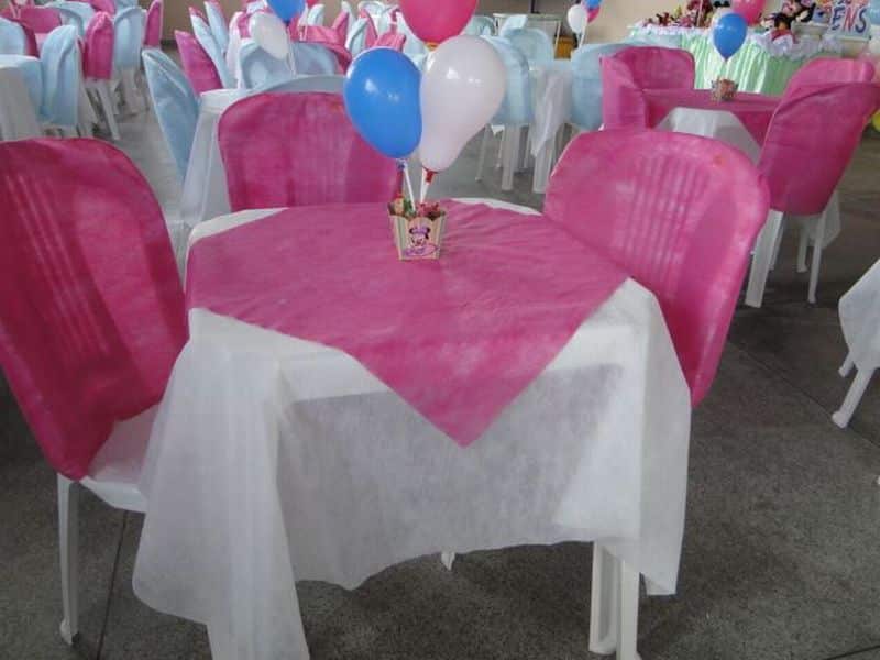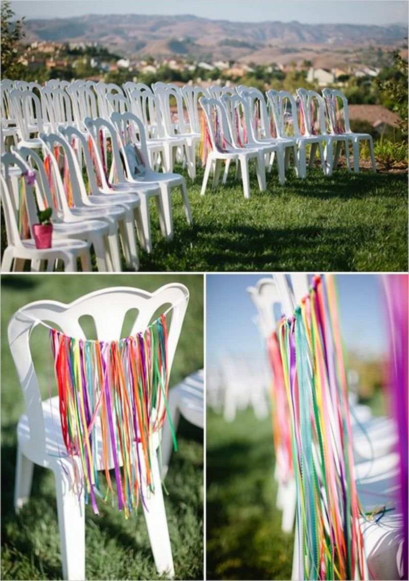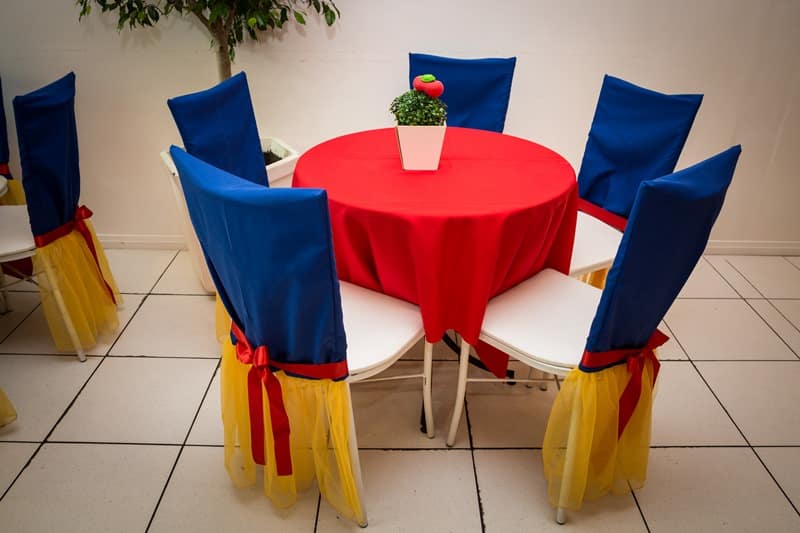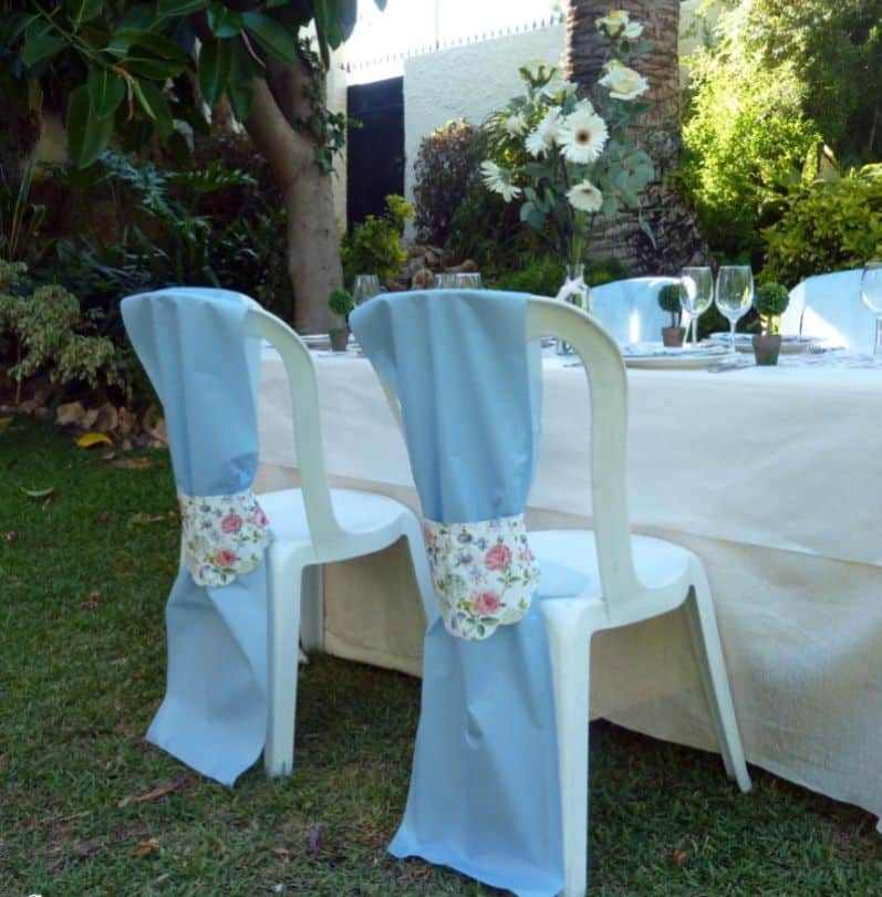 Para a sua festa você pode decorar as cadeiras de plástico com capas de tecido, com laços grandes de tiras de tecido, com tecido, com papel contact, com capas de TNT ou até mesmo com fitinhas coloridas.