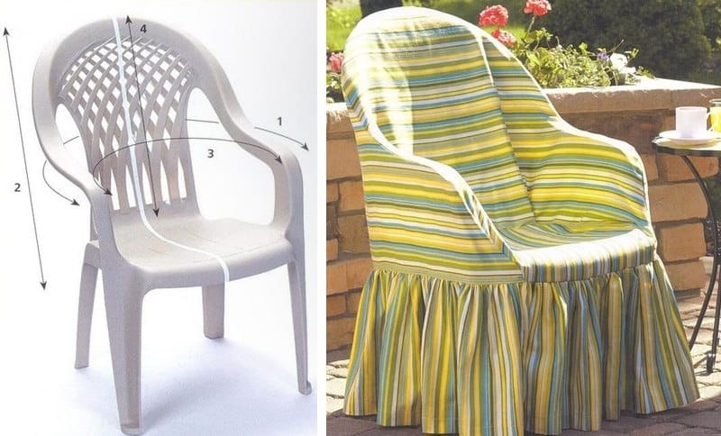 Faça uma capa de tecido para a sua cadeira de plástico e transforme-a em uma linda poltrona. Você pode colocar ou não um babado em sua capa de tecido.