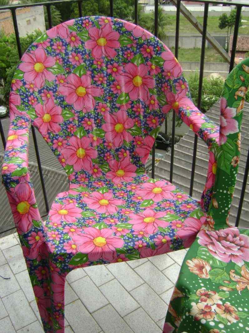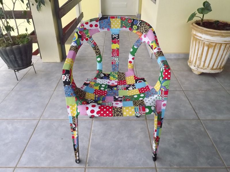 Você pode customizar a cadeira de plástico colando retalhos de tecido ou de papel, com cola para decoupage ou cola Cascorez ou fazendo almofadinhas de tecido para o assento.
