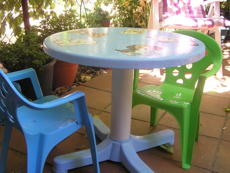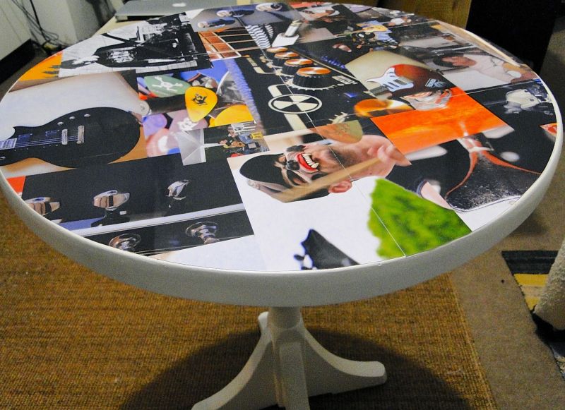 Você pode colar fotos em sua mesa de plástico ou colar figurinhas, para mesas infantis. Aplique cola para decoupage sobre todo o tampo da mesa.