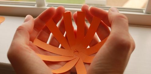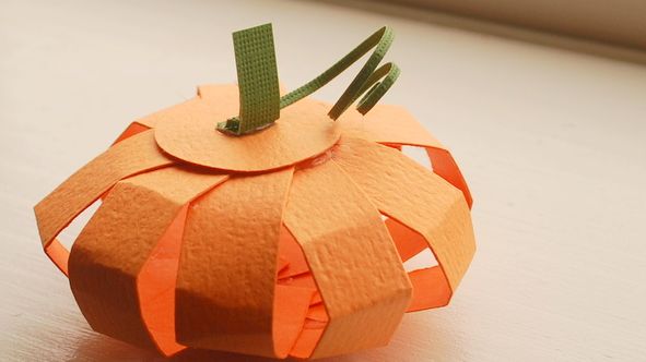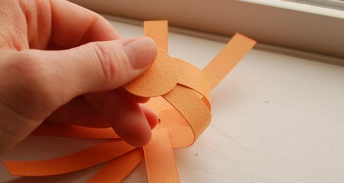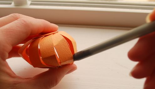 Logo após, com o auxílio de suas mãos, modele a sua abóbora, curvando as tirinhas do papel laranja.