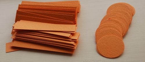Comece desenhando e recortando vários círculos e tirinhas no papel laranja, e com todos do mesmo tamanho. Você irá utilizar dois círculos e nove tirinhas para cada uma das abóboras.