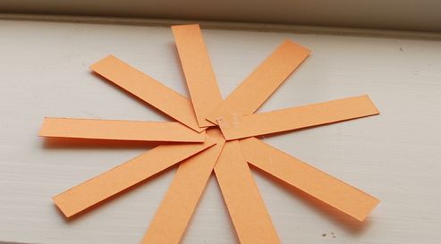 Em seguida, posicione nove tirinhas ao redor de um círculo do papel laranja e cole-as, com o auxílio da cola quente.