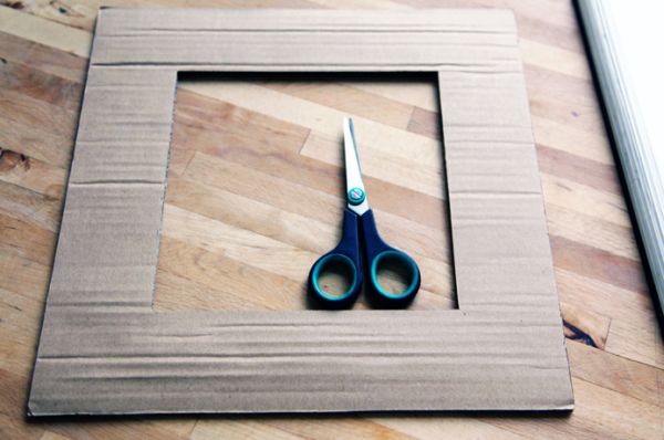Em seguida, com o auxílio da régua e do lápis, corte, na caixa de papelão, uma moldura, com o tamanho de sua preferência.