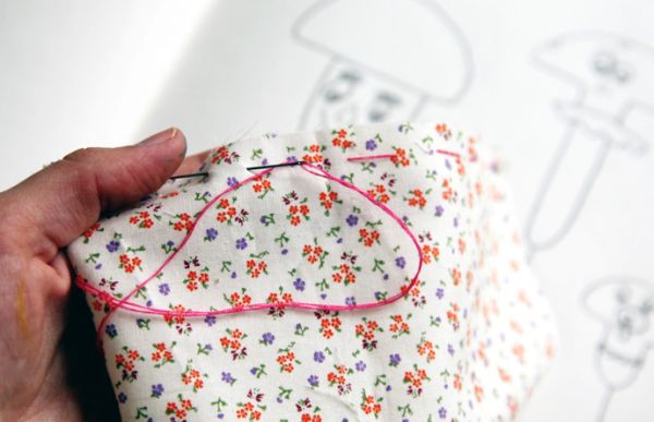 Agora, passe um alinhavo no pedaço de tecido escolhido. Esta será a cortina de seu teatrinho.