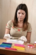 Coloque 50 ml de álcool na bandeja de isopor. Pegue um pouco de anilina do pote e coloque no álcool com pontinha do cabo de uma colher de chá. Vá mexendo até dissolver totalmente. Coloque inicialmente pouca anilina, pois é muito concentrada. Se por acaso ficar muito claro, vá colocando mais anilina, sempre utilizando o cabo da colher. Quando é colocado muita anilina de uma vez só, fica mais difícil clarear a mistura. Teste a tonalidade ao mergulhar um pouco de um palito cru na mistura.