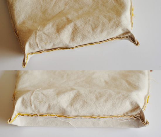 Agora, costure a outra parte do forro na primeira, com os lados do direito do tecido juntos, e costure os cantos retos. E costure os cantos, deixando-os retos também na mochila.