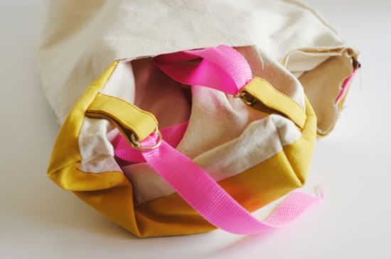 Logo após, para finalizar a sua peça, basta fechar a abertura deixada com pontos à mão. Passe as alças pelas argolinhas de metal. E está pronto!