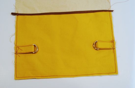 Em seguida, faça tirinhas de tecido, passe pelas argolinhas de metal e costure nas laterais do bolso da mochila.