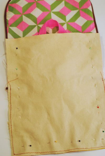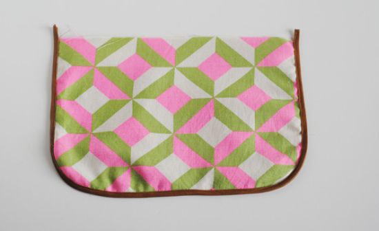 Logo após, corte a aba da mochila, que deve ter largura igual à da mochila e cantos arredondados costure a parte de fora e o forro juntos e costure o viés ao redor.
