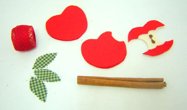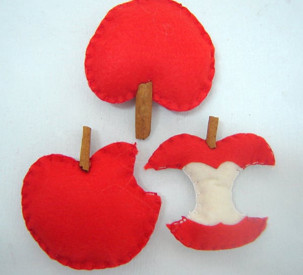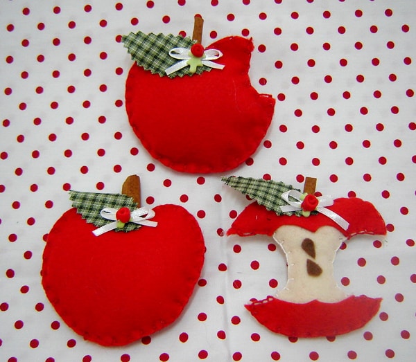 Se você for fazer a maçã mordida, cole as partes vermelhas sobre a parte creme e costure a parte creme com a linha creme e a parte vermelha com a linha vermelha. Cole a canela em pau na parte superior da maçã. Para finalizar a sua peça, cole os caroços na maçã cortada e cole as folhas, com os lacinhos por cima. E está pronto!