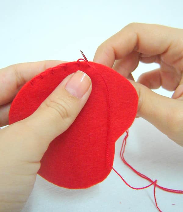 Junte as duas partes e comece a fazer o ponto caseado ao redor da maça. Antes determinar a costura, encha com o enchimento escolhido.