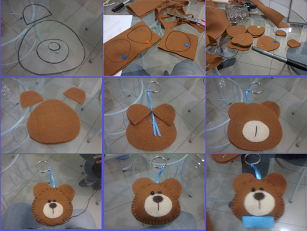 Transfira as partes do molde para as cores dos feltros escolhidos. Recorte. Cole as orelhas do urso na parte detrás e cole junto um pedaço de fita dobrado ao meio e passado pela argola para chaveiro. Na parte da frente do ursinho, cole a parte do focinho e faça os detalhes, bordando, colando e fixando as miçangas pretas como se fossem os olhos do urso. Posicione a parte da frente sobre a parte detrás e comece a fazer ponto caseado ao redor. Antes de fechar, encha o seu ursinho com a manta acrílica, com o plumante ou com outro enchimento de sua preferência, e termine de fechar a sua peça, com o mesmo ponto que já vem fazendo. Para finalizar a sua peça, faça uma gravatinha borboleta com um pedaço de fita e cole na parte de baixo da cabeça do ursinho. E está pronto!