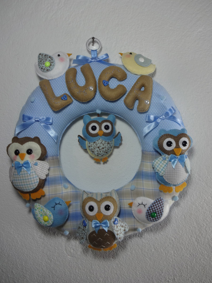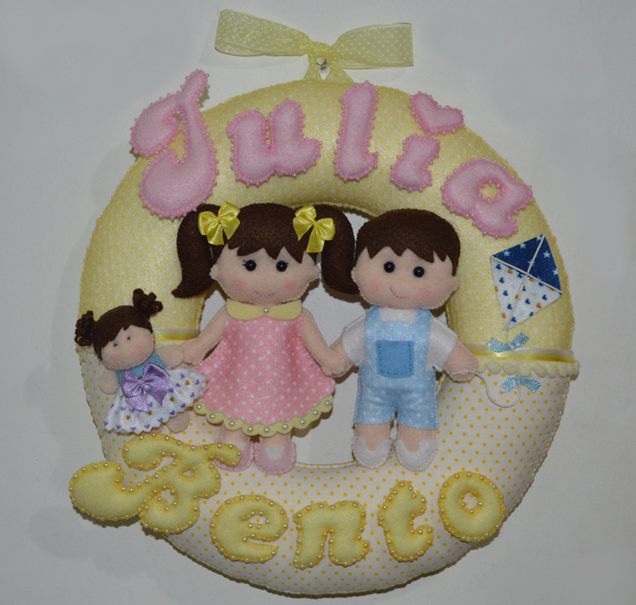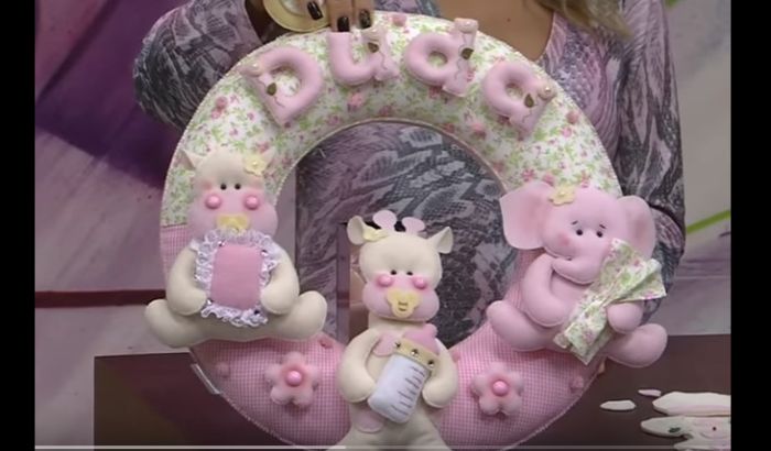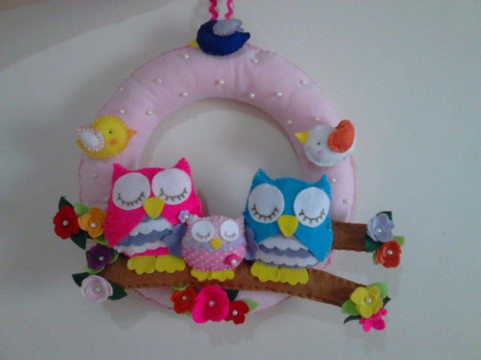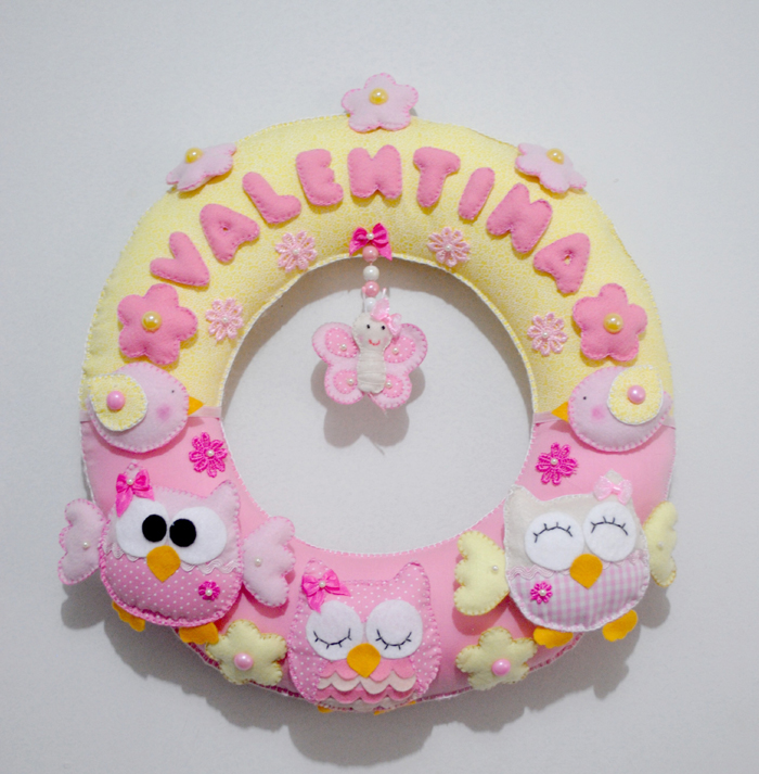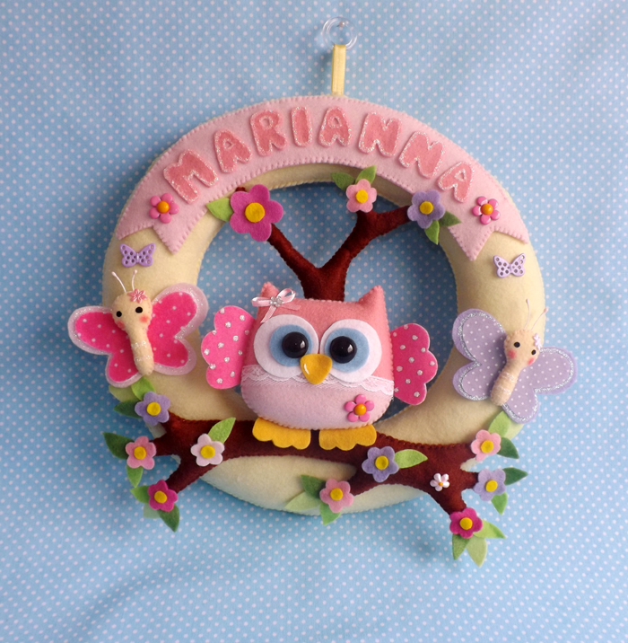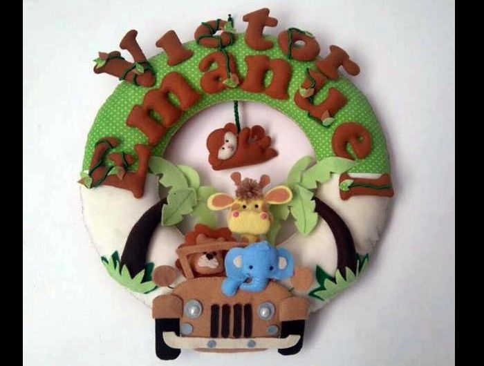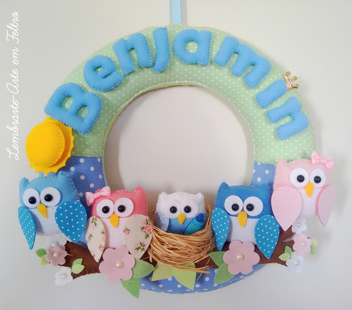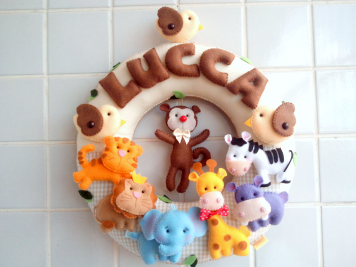 Com os bichinhos prontos e a base para guirlanda encapada, basta costurar os bichinhos na guirlanda. Se você quiser, escreva o nome da criança. Para finalizar a sua peça, enfeite a guirlanda com pedrarias, com aviamentos e com o que mais você desejar. E está pronto!