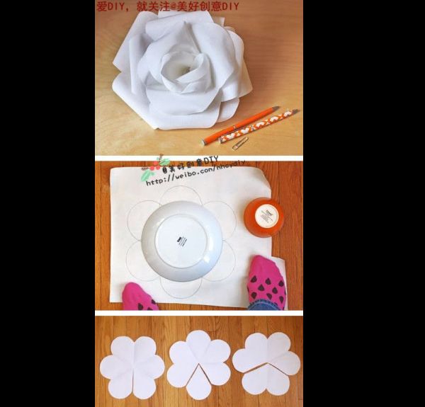 Faça um molde para rosa gigante riscando um círculo em um papel, fazendo pétalas com um objeto menor, recortando uma parte, para curvar e, depois, colando as partes curvadas juntas. Curve as bordas das pétalas da rosa com o auxílio de um lápis.