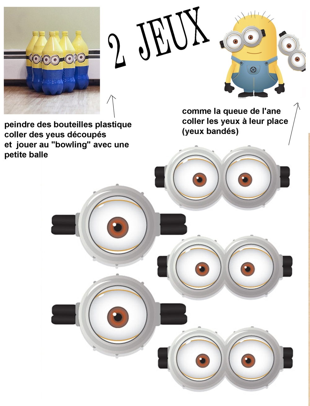 Você pode, por exemplo, imprimir olhos dos Minions para decorar as mais diversas peças de sua festa, como as garrafas de refrigerante, as mesas, as paredes do salão da festa, o painel que fica atrás da mesa do bolo, as lembrancinhas de sua festa, as bandejas dos doces ou dos salgadinhos que serão servidos na festa e as peças que você achar que pode decorar com estes olhos dos Minions.