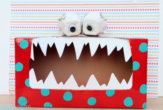 Faça uma abertura bem grande, com o auxílio da tesoura, na caixa de papel já pintada, para que você tenha um monstrinho com boca bem grande. E com os dentes já cortados, cole-os com cola quente no lugar da boca do seu monstrinho. E está pronto seu artesanato!