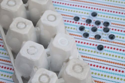 Separe as cumbuquinhas da bandeja de ovos com a tesoura, pois cada uma deverá ser um olho. Pinte se preferir, e depois, com a tinta seca, cole os olhinhos com a cola quente na parte de cima da caixa.
