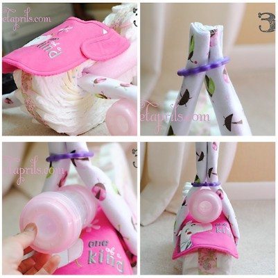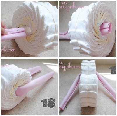 O primeiro passo é formar as rodas com várias fraldas sobrepostas de forma que elas formem um círculo para ter duas rodas.