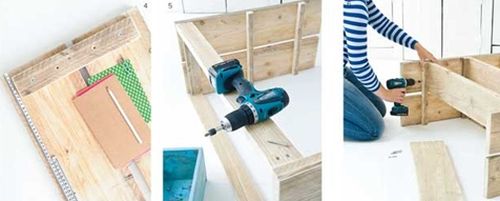 Em seguida, com o auxílio da furadeira e dos parafusos, monte a parte dos pés e da base de seu móvel. E se você quiser um móvel com várias divisórias, este é o momento de acrescentar algumas prateleiras na estrutura do móvel.