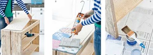 Comece desmontado as partes de suas pallets e serrando as partes com os tamanhos desejados para a confecção de sua peça, podendo ser uma peça que utiliza todo o comprimento da pallet ou uma peça menor, de acordo com a sua preferência. Depois lixe todas as partes de madeira, com o auxílio da lixa. E comece montando a parte de cima de seu móvel, a parte que receberá os azulejos, por isso você deve medir o tamanho de seus azulejos para adequar o seu tampo a estas medidas.