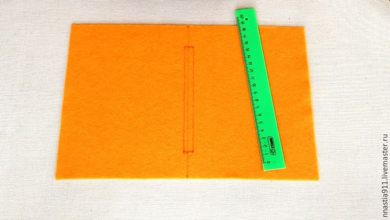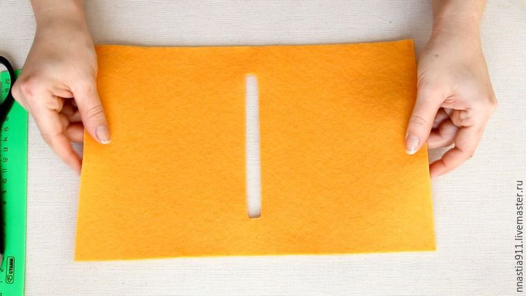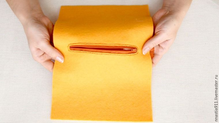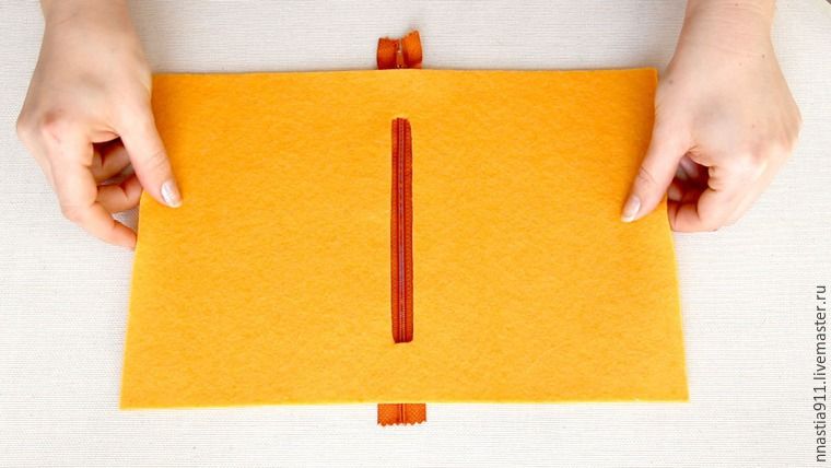 Corte um retângulo no feltro escolhido e faça um risco no meio. Desenhe uma tira no risco, para acomodar o zíper.