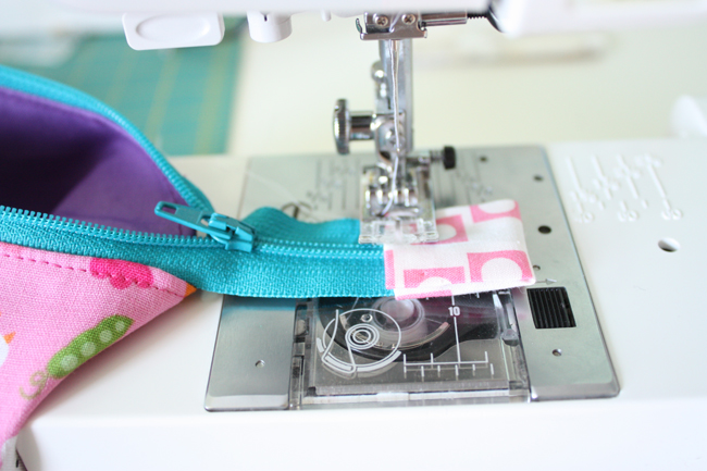 Vire a peça para o lado do direito do tecido, pela abertura deixada no forro. Arrume, passe a ferro, e costure ao redor de toda a borda, passando pelo zíper.