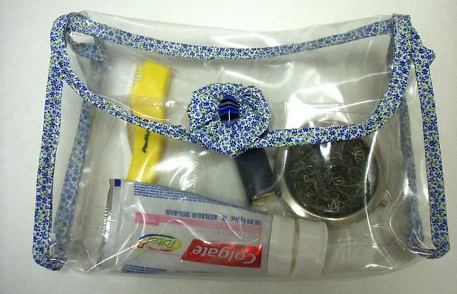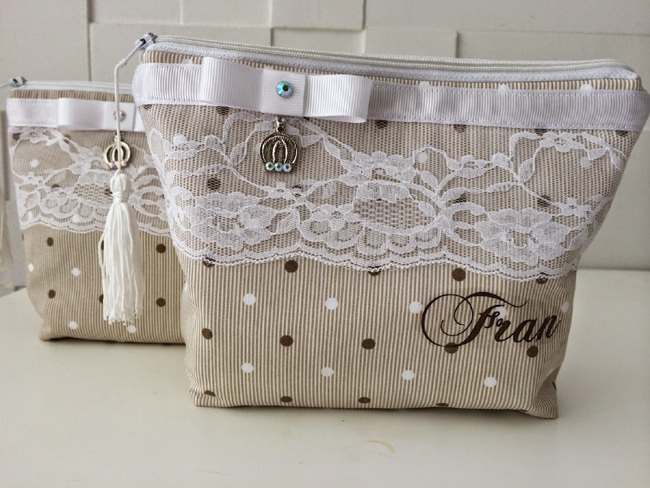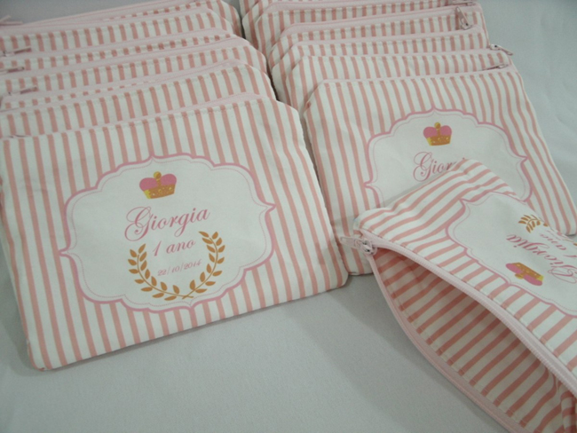 A nécessaire de tecido para lembrancinhas deve seguir as cores da festa, mas pode ser confeccionada com qualquer tecido e ter qualquer complemento.