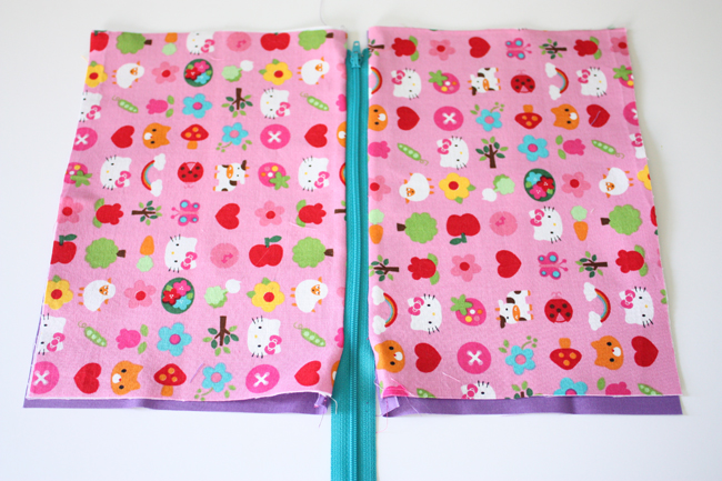 Posicione o zíper com o lado do direito para baixo, sobre o direito da parte principal e com o direito do forro também para baixo. Costure tudo junto. Abra as partes.