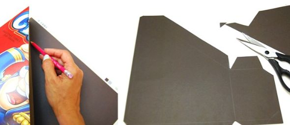 Comece, com o auxílio da régua, do marcador permanente e da tesoura, riscando e cortando a caixa de cereal em formato em diagonal na parte superior.