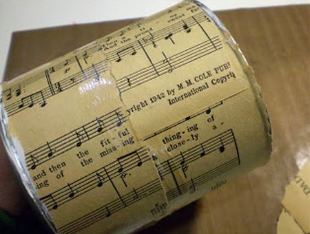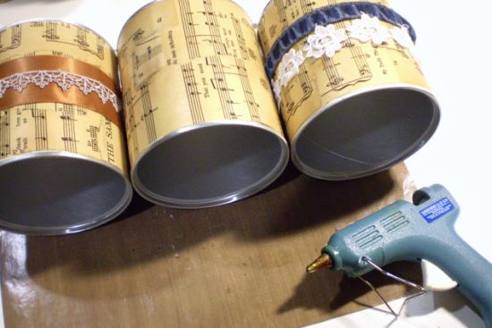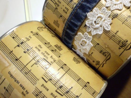 Para fazer esta sofisticada peça você irá precisar de: papel para scrapbook com a cor ou estampa de sua preferência (aqui foi usado um papel estampado com notas musicais); gesso; fitas decoradas e passamanarias (com modelos e cores de sua preferência); cola quente; pincel; latas de leite; pano para limpeza limpo; cola branca; e verniz.