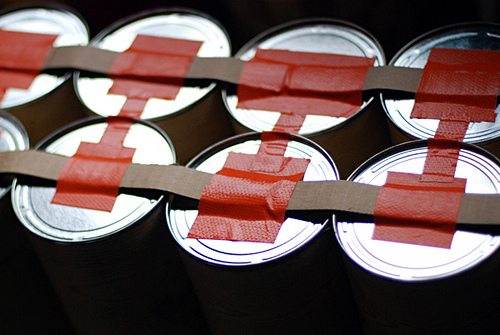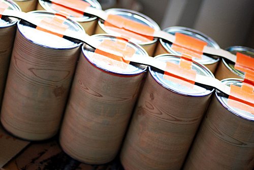 Assim que você encapar todas as latas que quer para o seu organizador, cole uma lata na outra, com o auxílio da cola tudo. Depois, nas partes dos fundos das latas, fixe pedaços de papelão, com o auxílio da cola tudo e também de pedaços de fita adesiva bem resistente.