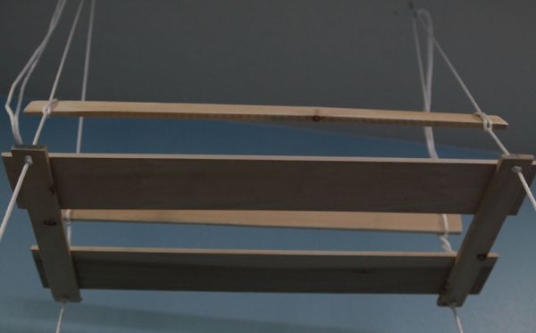 Logo após, posicione as cordinhas para varal ou o cordão fino escolhido nas repartições de madeira que você criou. E nesta etapa você deve furar as pontas das tábuas, com o auxílio da furadeira e de uma broca específica, passar o cordão ou a cordinha, fazer nós na parte de baixo da repartição e fazer nós também nas tirinhas de madeira que serão a gradinha de segurança de sua peça.