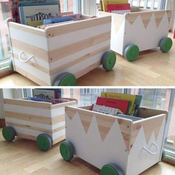 O seu organizador pode ser feito com caixote de feira. Você pode pintar o caixote. Fixe rodízios na parte de baixo. Para fechar a caixa crie um tampo com um pedaço de madeira, espuma e tecido, para a sua criança poder sentar. Fixe a tampa na caixa com dobradiças e parafusos.