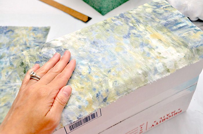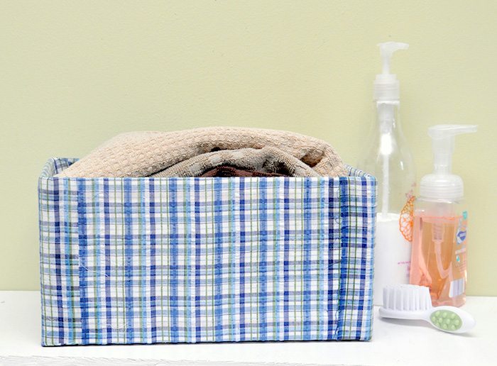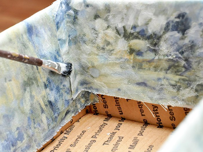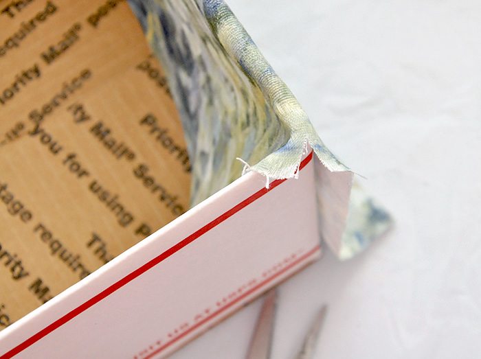 Para finalizar a sua peça, termine de colar as outras partes de tecido. E está pronto o seu organizador de caixa de papelão e tecido.