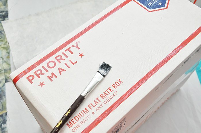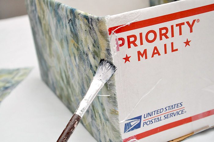 Aplique cola para decoupage em uma das partes da caixa, com o auxílio do pincel comum, para espalhar melhor.