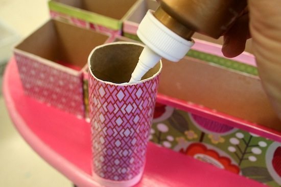 Corte aos papéis escolhidos com os tamanhos das divisórias, aplique cola para decoupage com o auxílio do pincel comum e encape todas as divisórias.