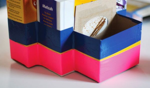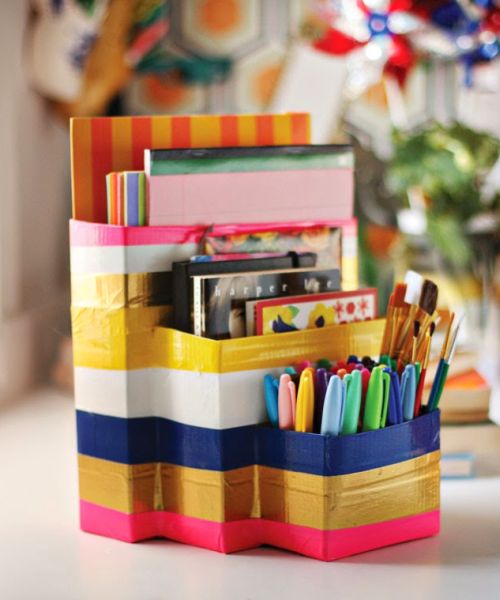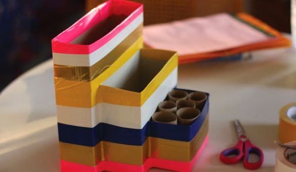 Agora, para finalizar a sua peça, fixe pedaços de fita adesiva também na borda de cada divisória de seu organizador. E está pronto! Agora basta guardar o seu material dentro do seu novo organizador. Lembrando que você também pode guardar outros itens dentro da sua peça.