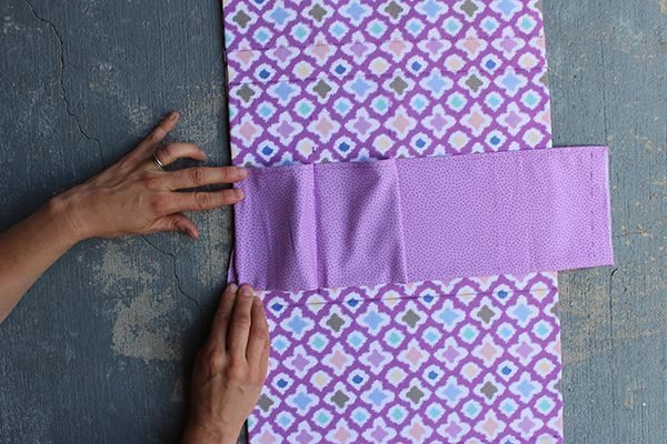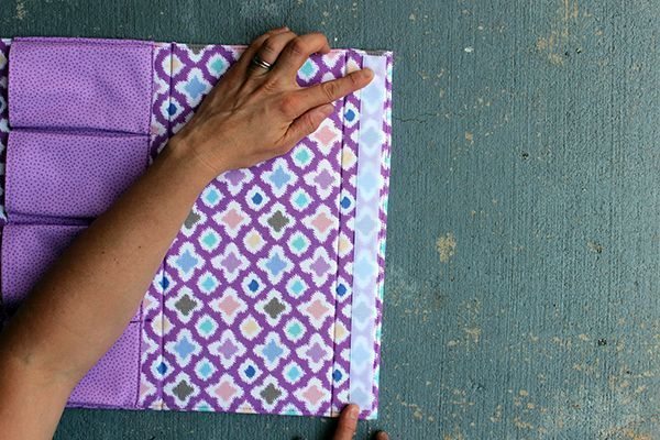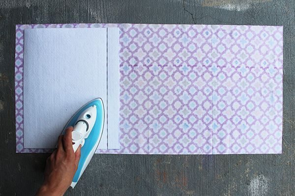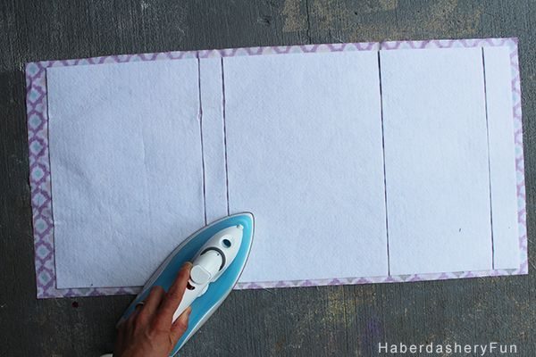 Logo após, termine de fixar as partes de entretela que serão as divisórias de sua peça. Passe a ferro as bordas para dentro, para o lado do avesso. Faça o mesmo com o forro, deixando as partes com o mesmo tamanho.