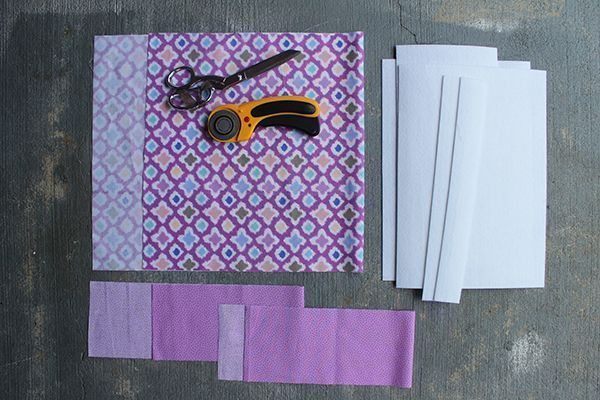 Comece separando todos os materiais que você vai utilizar em seu artesanato. Depois corte uma tira larga comprida para ser a base do seu organizador. Então corte tiras mais finas em outro tecido ou, no mesmo tecido, se você preferir. Corte partes menores e até tirinhas na entretela grossa.